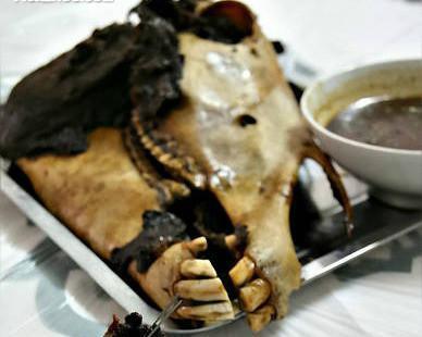 猴头:这里说的猴头绝不是食用菌猴头,而是真正的猴脑。一个中间挖洞的方桌,几个人围桌而坐,中间的洞并不像火锅或者是麻辣烫那么大,正好容一只猴子的头伸出。一只非常可爱的猴子牵出,据说那是专门食用的猴儿,头比较大。猴儿的头顶从小洞中伸出,用金属箍住,并且箍的非常紧,用小锤轻轻一敲,头盖骨应声而落。猴的脑部就完全裸露在食客们面前。这时,有较馋一些的人,已经用汤匙伸向红白相间的猴脑,随着桌下垂死猴子的一声惨叫,拉开了生食猴脑惨状的序曲。