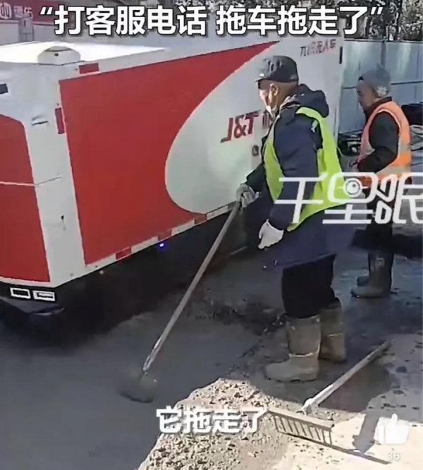 在场人员称,工地有围挡,留了个小门进出,快递车就进来了,打了客服电话把车拖走了,工人重新铺了路面。