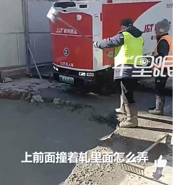 11月25日,河北廊坊。一辆无人快递车误闯施工现场,不顾工人阻拦,驶进刚铺的水泥路里。