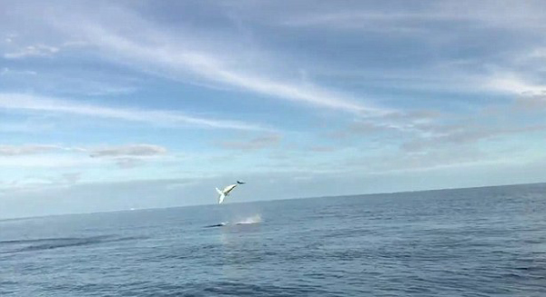 【环球网综合报道】 据英国《每日邮报》1月17日报道,近日,美国数名渔民在佛罗里达州印度岩海滩附近的海域内意外钓到一条巨型尖吻鲭鲨。为挣脱鱼钩,尖吻鲭鲨从水中一跃而起,反复上演腾空特技,最终成功逃回海面。当时巨鲨距船身极近,场面可谓十分惊险。