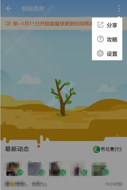 打开自己的蚂蚁森林,没有树的先领养一颗小树苗,然后,点击右上角的三个点,就可以看见“攻略”。