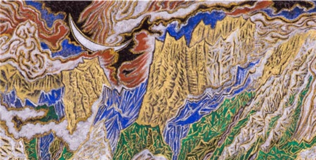 东方的宇宙观,在余先生的笔触下呈现,山通过画家而绘就,画家也成为山的冥想的一部分。他所使用的颜料,源自大地的矿物质,层层叠染,唤起盛唐时期的皇家色彩——朱砂、青金、鎏金。千年前,这些色彩曾随唐朝的公主远嫁吐蕃。